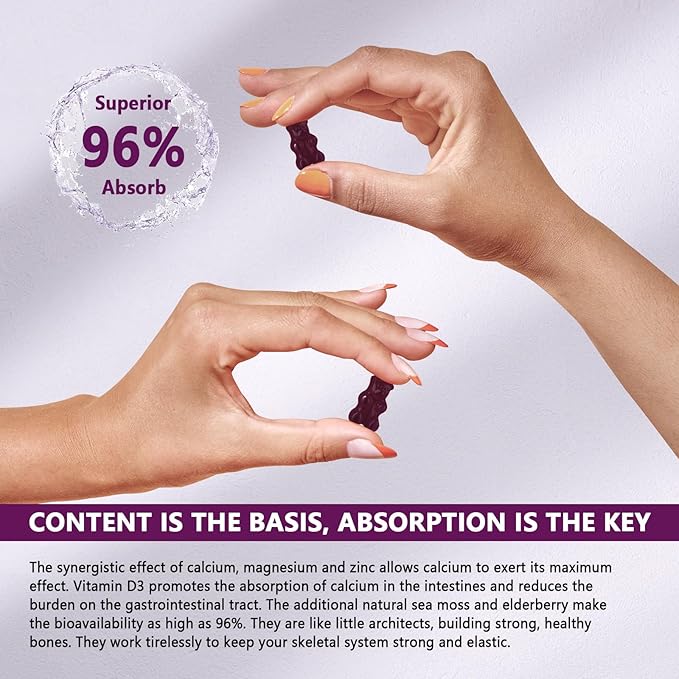 - Optimum Absorption and Bioavailability: Our calcium magnesium supplement uses a scientific ratio of 2:1, magnesium glycinate and vitamin D3 to promote calcium absorption in the body, for extra strength we add natural vitamin-rich organic sea moss and bone set Fruity, a mineral that studies show has a calcium absorption rate of up to 96%, Chewable Calcium Magnesium Zinc Gummies are an excellent alternative to tablets, capsules or tablets.