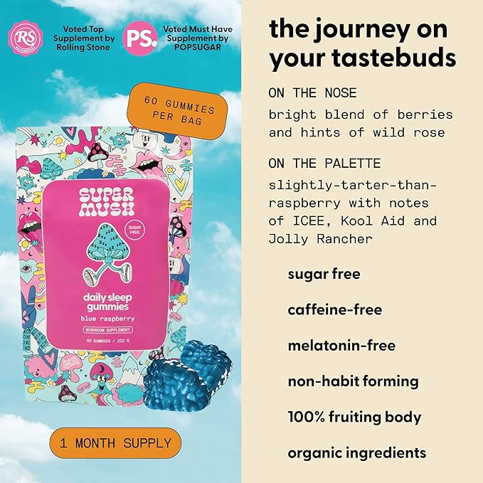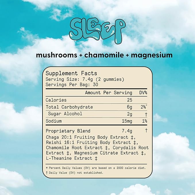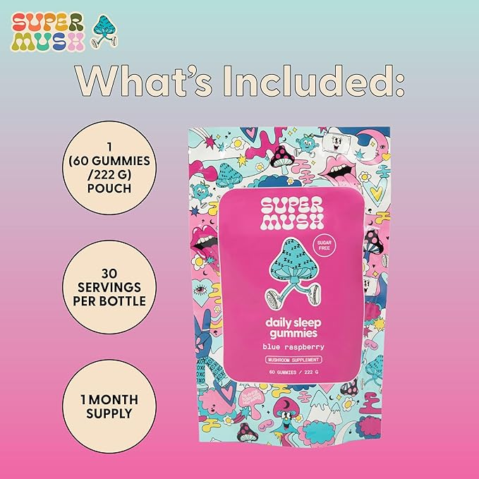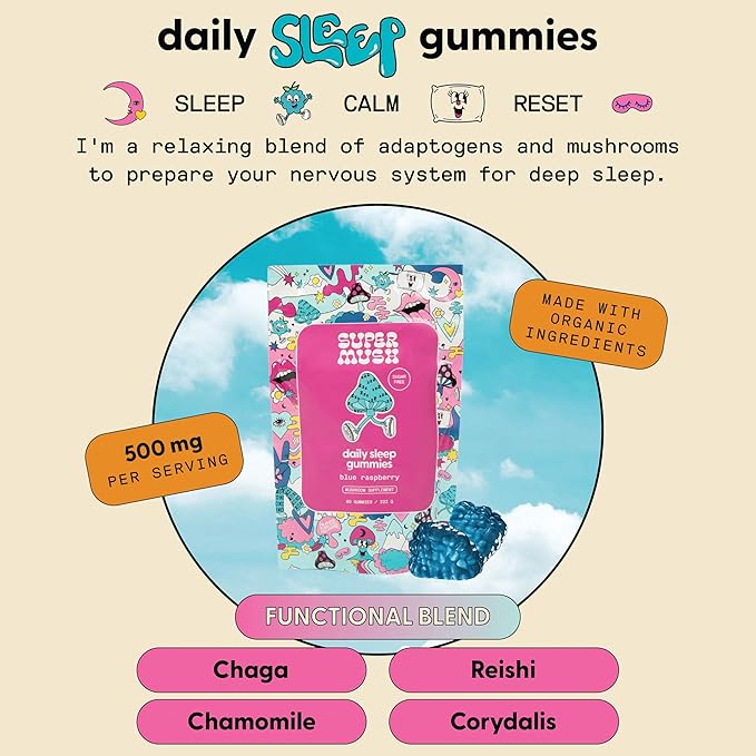 - ENHANCED DEEP SLEEP FORMULA - SuperMush Daily Sleep Gummies 60 Count (30 Servings) are formulated with a unique blend of Chaga, Reishi, Chamomile, Corydalis, Magnesium Citrate, and L-theanine to support deep REM sleep and relaxation. These powerful mushroom gummies help to regulate your sleep cycle and improve overall sleep quality leaving you feeling energized, clearheaded, less stressed, and well rested in the morning.