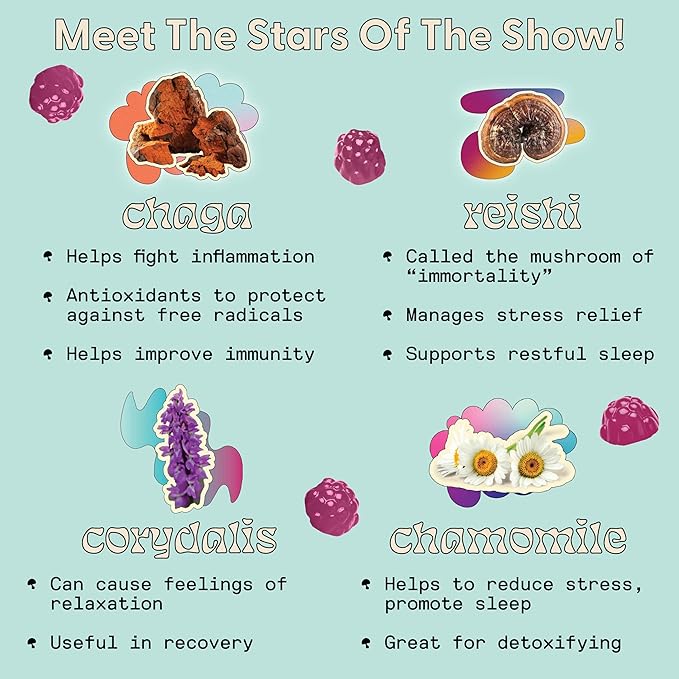 - SUPERIOR SLEEP SUPPORT - Fall asleep faster, stay asleep longer & wake up refreshed with Sleep Gummies for adults. These potent mushroom gummies combine functional mushrooms Chaga & Reishi with key relaxation ingredients like Chamomile & Ltheanine. Chaga provides antioxidants to support cellular health, while Reishi has adaptogenic properties to help the body manage stress. Together, these real mushrooms work to calm the mind and body, promoting deeper, more restful sleep.