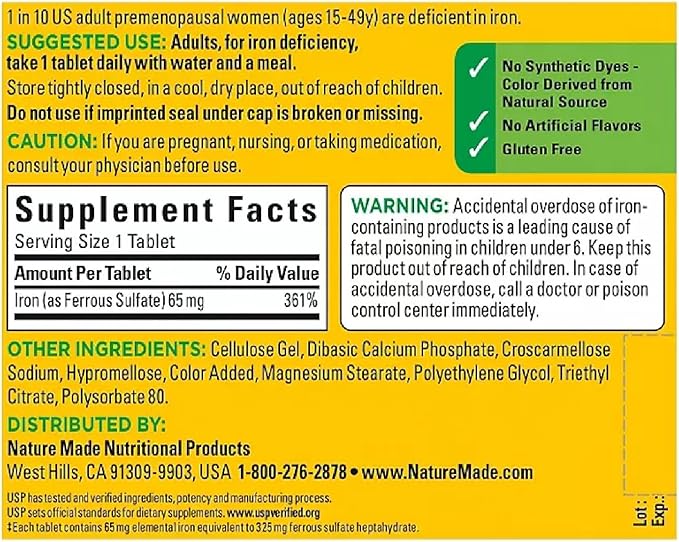 - ✅ Iron support supplement: contains one 365 count bottle of Nature Made Iron 65 mg (325 mg Ferrous Sulfate)(1) Tablets for a 365-day supply