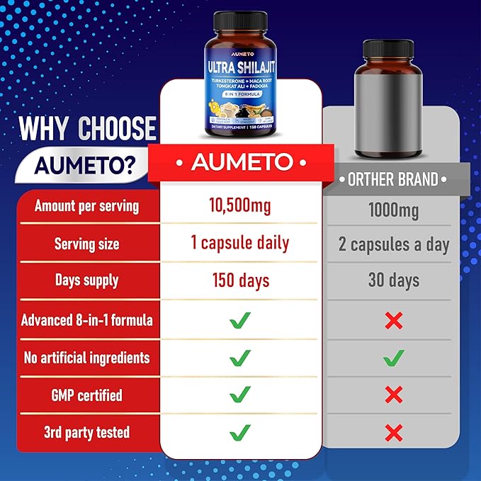- Overall wellness boost: Aumeto Shilajit offers a myriad of advantages, simplifying the path to enhanced vitality. This specially formulated blend attends to your individual needs, providing support with minerals and fulvic acid, enhancing strength, and promoting better memory and brain function. Just adding one capsule to your daily routine effortlessly introduces you to the wonders it holds.