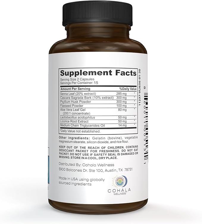 - Natural Ingredients: The Cleanse is made with a carefully curated blend of natural ingredients. Senna Leaf and Cascara Sagrada Bark extracts help stimulate healthy bowel movements, promoting regularity. Psyllium Husk Powder and Flaxseed Powder provide gentle fiber to support healthy digestion. Aloe Vera Leaf Gel soothes and nourishes the gut lining, while Lactobacillus acidophilus contributes to a healthy gut microbiome. Licorice Root Extract and MCT Oil further support digestive balance.