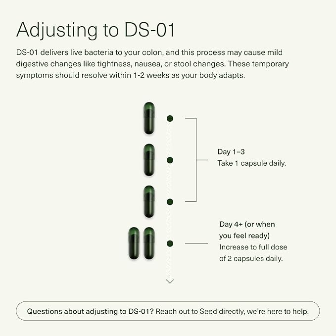 - Getting Started: If it's your first time taking DS-01, or its been more than a week since your last dose, take 1 capsule daily for three days before moving on to 2 capsules daily. You may notice mild gastrointestinal discomfort or changes in digestion. Any discomfort typically resolves in 1-2 weeks.