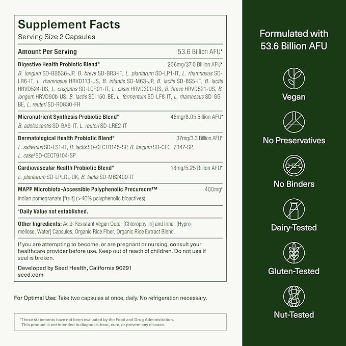 - 2-in-1 Prebiotic + Probiotic: Seed DS-01 Daily Synbiotic is formulated with 24 clinically and scientifically studied probiotic strains and a patented, plant-based prebiotic outer capsule to deliver benefits in and beyond the gut. 53.6 Billion AFU.
