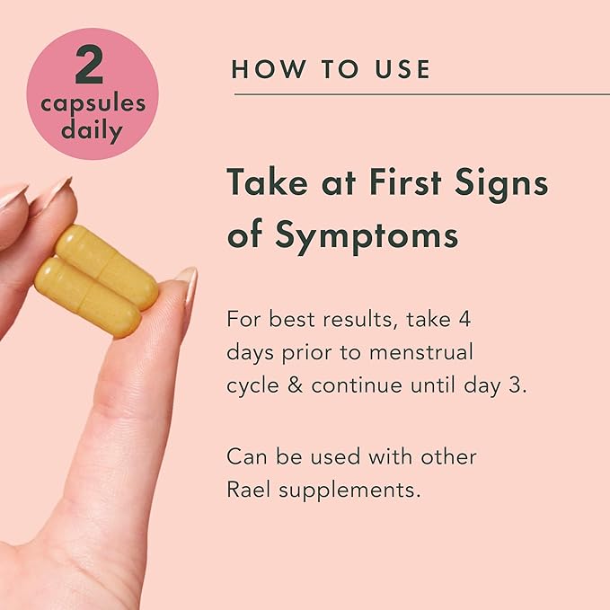 - EFFORTLESS & EFFECTIVE FORMULA - Only needs to be taken during the week of your menstrual cycle, not all month long. Take 2 capsules as needed at first signs of menstrual symptoms. To feel full results, we recommend taking them 4 days prior to your menstrual cycle and continue until day 3. Safe to be taken with or without food.