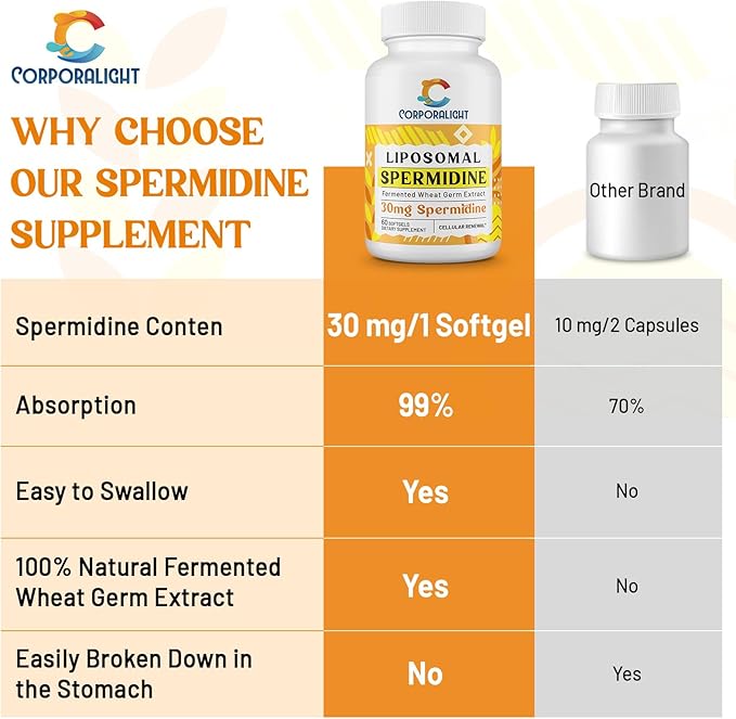 - 99% Absorption - Spermidine is well known for having poor bioavailability. Our spermidine supplement makes use of a leading liposome delivery system that transports the nutrition to the most in-need cells, allowing you to get the most out of every spermidine softgel. Compared to regular spermidine supplements, our spermidine enhances absorption by up to 99% for cells.