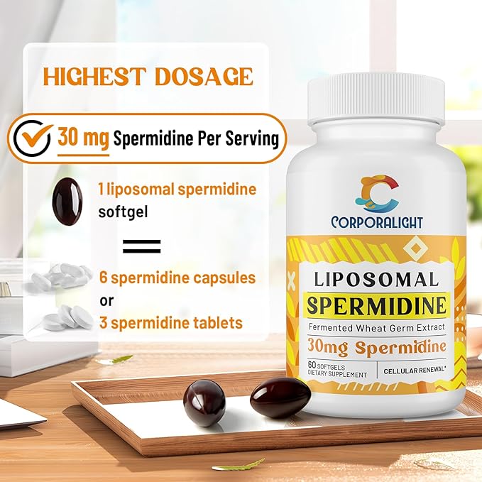 - Superior Dosage, 30mg Spermidine Per Softgel - Spermidine is a biogenic polyamine that as we age, declines spermidine levels in our body. Our product contains a wheat germ extract three more concentrated than other products, providing 30mg of spermidine per capsule. Research indicates that spermidine is good for aging defense, boosts cellular renewal, induces autophagy, and mitochondrial function, and extends the lifespan.