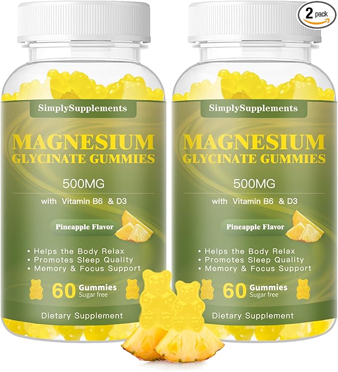 Magnesium Glycinate Gummies 500mg, Chewable Magnesium Supplement with Vitamin D3, B6, CoQ10, for Relaxation, Sleep & Mood Support, Calm Magnesium Gummies - 60 Pineapple Gummies (2 Pack)