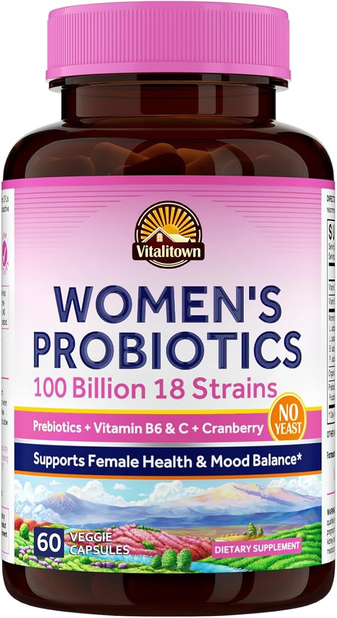 Vitalitown Women’s Probiotics | 100 Billion CFUs 18 Strains | Prebiotics, VC & B6, Cranberry | Shelf Stable | Vaginal, Urinary, Digestive & Mood Support | 60 Vegan Caps
