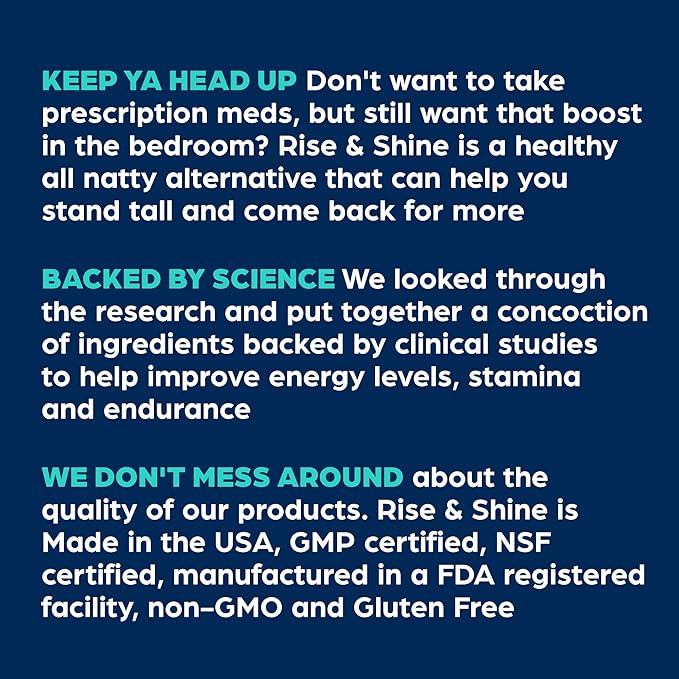 - KEEP YA HEAD UP: Rise & Shine is an all-natural performance and stamina supplement for men that can help you stand tall and come back for more.