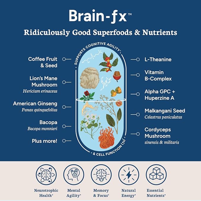 - START YOUR DAY WITH ADAPTOGENS FOR STAMINA & CLARITY: Uplevel your stress management for better cognitive performance support with Brain-fx! Packed with Whole Coffee Berry, Lions Mane, Cordyceps sinensis, Cordyceps militaris, Malkangani, Bacopa, American Ginseng, & L Theanine to help you manage adrenal health & peace of mind.*