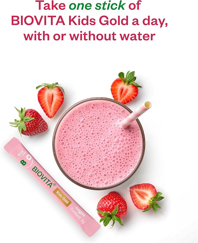- BIOVITA KIDS PROBIOTICS GOLD (2g x 30 sticks) - Discover BIOVITA Kids Probiotics Gold for your child's ultimate defense. Our exclusive 3-Strain Complex, including powerful bifidobacteria, digestive enzyme-producing bacteria, and lactobacilli, promotes a robust immune system while enhancing digestive health. It's the daily boost your growing child needs for a healthy, happy life. Each box contains 30 days' servings.