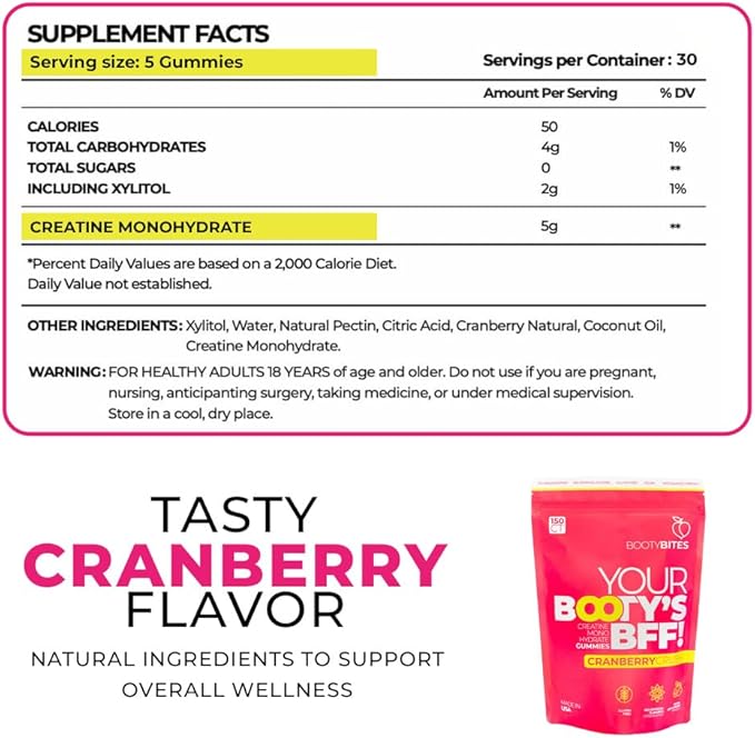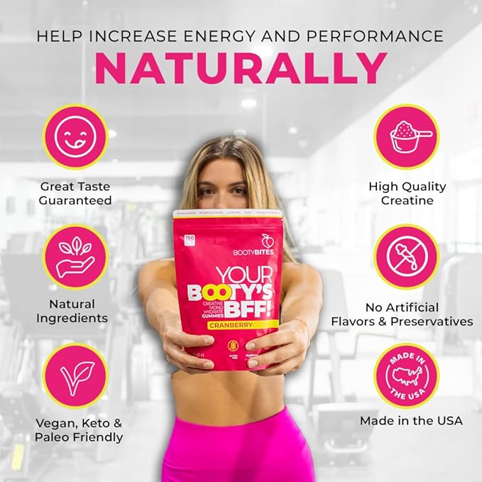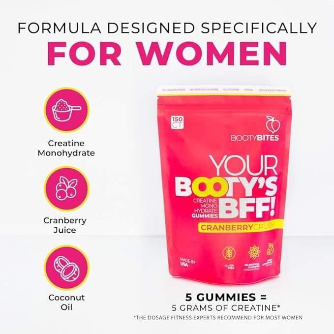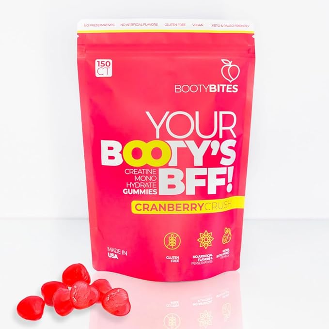 - YOUR BOOTY’S BFF: Meet your fitness goals with BootyBites cranberry creatine monohydrate gummies, made with natural ingredients to maximize effectiveness. Designed to support women in their fitness journey, these creatine chews help enhance muscle tone without the worry of bulky muscle growth. Made for daily use, these creatine for women gummies offer a delicious and convenient way to boost your workout routine.