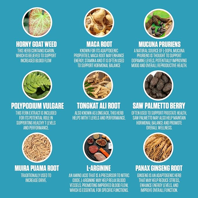 - Energy and Stamina Boost: Unleash your inner dynamo with the energy-boosting properties of Horny Goat Weed. Experience enhanced endurance and vitality, allowing you to tackle the demands of your day and night with renewed vigor.
