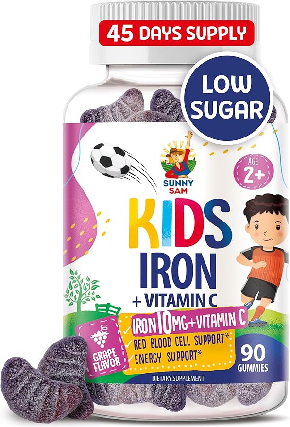 SUNNY SAM Iron Gummies for Kids & Teens - 10mg Iron Vitamins with Vitamin C - Low-Sugar Chewable Iron Gummy Supplement for Immune Support, Supports Red Blood Cell Production for Children & Teen Girls