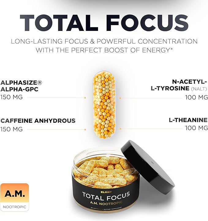 - A.M. TOTAL FOCUS - A robust synergistic blend with AlphaSize Alpha GPC, N Acetyl L Tyrosine, Caffeine and L Theanine for long-lasting focus, dynamic concentration, and the perfect calm, sustained energy boost to help you overcome distractions and stay on your game all day long. ALPHASIZE is the only Alpha GPC validated by numerous research studies to improve memory, recall energy and focus as well as enhance physical performance & peak power output. Additionally, it outperforms other choline and acetylcholine supplements as demonstrated in numerous published studies.*