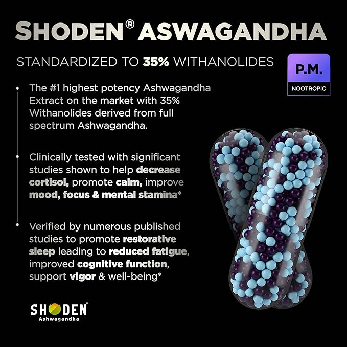 - P.M. TOTAL CALM - Shoden Ashwagandha and L-Theanine balanced with Magnesium, GABA and Apigenin as the perfect evening cocktail to elevate mood and calm the mind when you're ready to wind down without incurring sleepiness or grogginess. SHODEN is the #1 highest strength Ashwagandha Extract on the market with 35% Withanolides and is substantiated by numerous clinical studies to be an effective mood booster and calming supplement for adults, as well as promote restorative sleep to reduce fatigue & brain fog, and support mental clarity, cognitive function & brain health.*