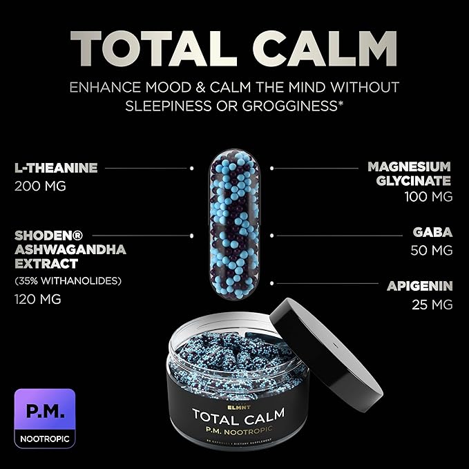 - P.M. TOTAL CALM - Shoden Ashwagandha and L-Theanine balanced with Magnesium, GABA and Apigenin as the perfect evening cocktail to elevate mood and calm the mind when you're ready to wind down without incurring sleepiness or grogginess. SHODEN is the #1 highest strength Ashwagandha Extract on the market with 35% Withanolides and is substantiated by numerous clinical studies to be an effective mood booster and calming supplement for adults, as well as promote restorative sleep to reduce fatigue & brain fog, and support mental clarity, cognitive function & brain health.*