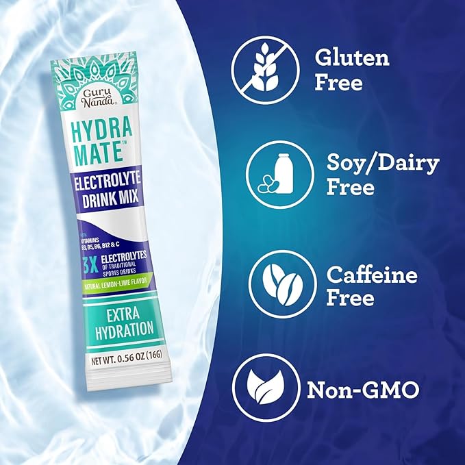 GuruNanda Hydramate Hydration Support Drink Mix - Electrolyte Powder Packets for Dehydration, Exercise & Energy - No Added Sweeteners, Non-GMO, Natural Lemon Lime Flavor - 2 Count (0.56 oz Each)