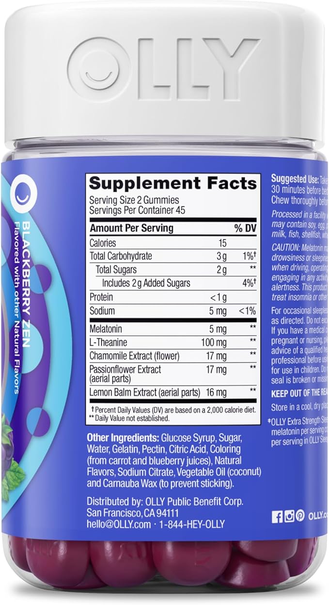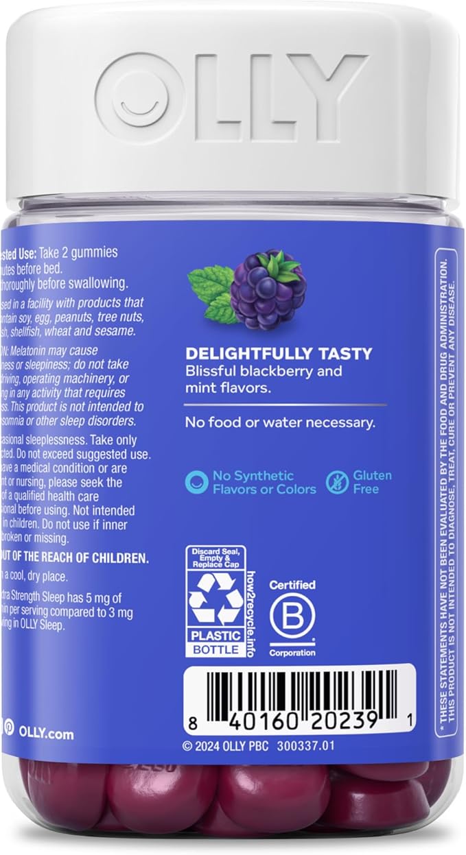 - OLLY EXTRA STRENGTH SLEEP GUMMIES: Melatonin gummies, with L-Theanine that works with your body to help you fall asleep and stay asleep*