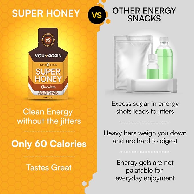 - Natural Energy Gel for Athletes: Each single-serve packet of Super Honey delivers pure, clean energy to fuel your active lifestyle. Designed for convenience, our superfood honey packets fit effortlessly in your running belt, pocket, or bag, giving you a quick boost to feel like You Again!