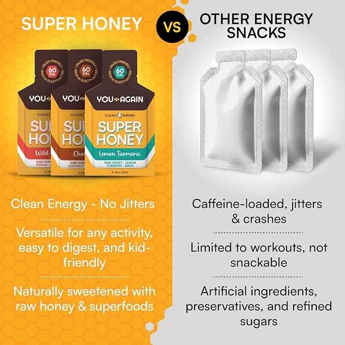 - Natural Energy Gel for Athletes: Each single-serve packet of Super Honey delivers pure, clean energy to fuel your active lifestyle. Designed for convenience, our superfood honey packets fit effortlessly in your running belt, pocket, or bag, giving you a quick boost to feel like You Again!