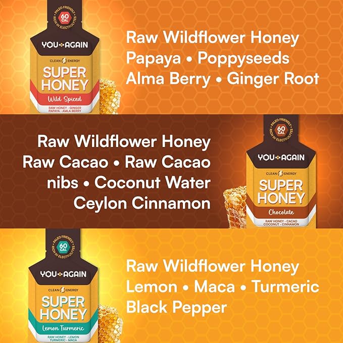 - Healthy Lifestyle Fuel: You Again Raw Honey is a quick and clean energy source of 17g easy-to-digest simple carbs for your active life. It's Paleo, Gluten-Free, Grain-Free, and Caffeine-Free with four delicious flavors (Chocolate, Wild Spiced, Lemon Turmeric, Honey & Salt) to keep you fueled during workouts, without an upset stomach.