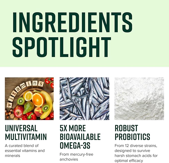 - 3-in-1 Convenience: Combines essential multivitamin, Omega-3, and probiotics in one capsule; Contains Vitamins A, B12, C, D3, E and essential minerals like selenium, magnesium and zinc; Simplifies your routine without compromising quality