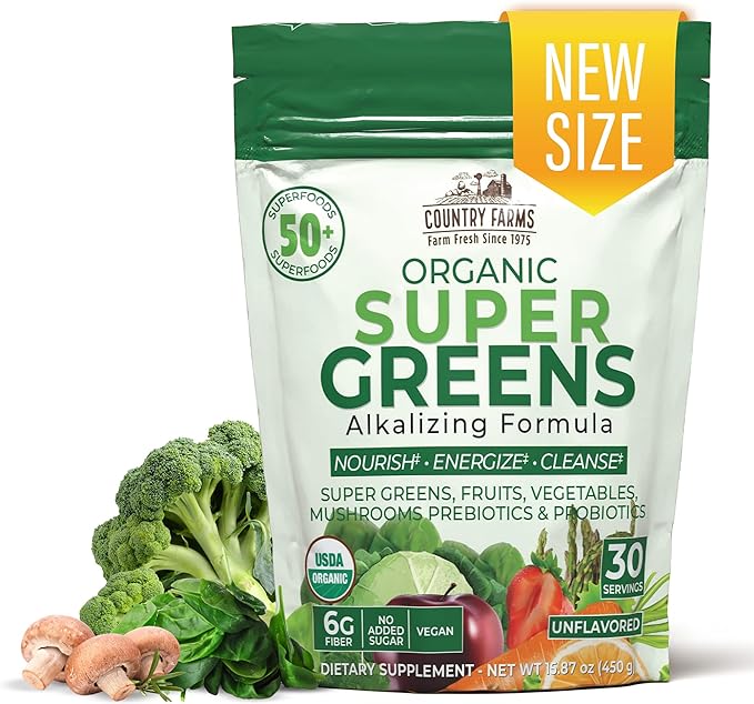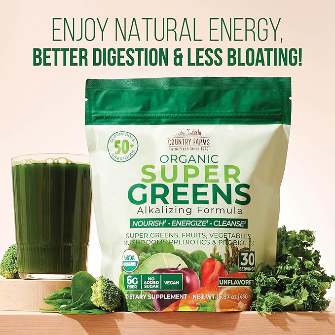 - UNLEASH NATURAL ENERGY. Country Farms Super Greens is a dynamic fusion of 50 premium organic superfoods, meticulously chosen to deliver natural energy in every serving. This carefully crafted blend provides a sustainable vitality boost without the jitters or crashes associated with artificial stimulants. Unleash your natural energy with Country Farms Super Greens.
