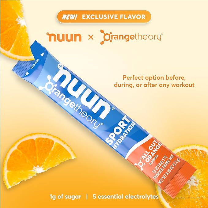 Nuun Sport Electrolyte Powder Packets - All Out Orange, 5 Essential Electrolytes for Hydration, Exclusive Orangetheory Fitness Flavor, 1g Sugar, Non GMO, Vegan, 16 Single Serving Sticks