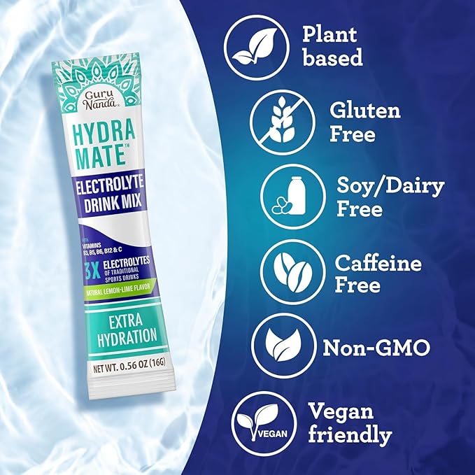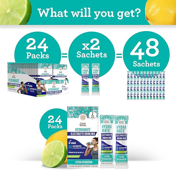 GuruNanda Hydramate Hydration Support Drink Mix - Electrolyte Powder Packets for Dehydration, Exercise & Energy - No Added Sweeteners, Non-GMO, Natural Lemon Lime Flavor - 48 Count (0.56 oz each)