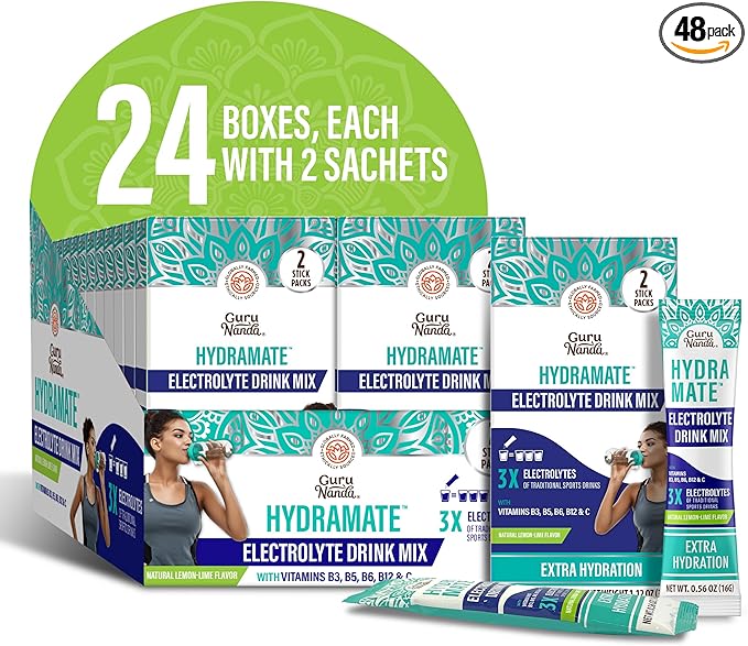 - 48-COUNT CONVINIENCE FOR ULTIMATE HYDRATION: The GuruNanda Hydramate Support contains 24 packs, with each pack comprising 2 sachets, totaling 48 sachets. Mixing just one sachet in a 16 fl. Oz glass offers hydration equivalent to drinking 3 glasses, ensuring quick absorption of electrolytes and water to keep you consistently energized throughout the day.