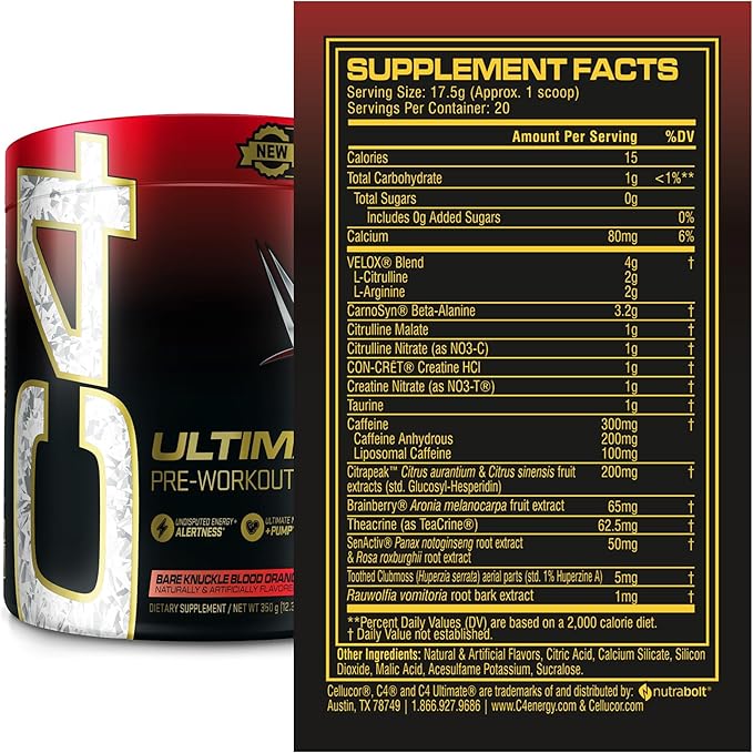 - Product Benefits : Supercharged with 300mg of caffeine, including 100mg from Liposomal Caffeine, you’ll unleash next level energy for next level workouts. With our premium ingredients, experience muscle splitting pumps from enhanced nitric oxide and elevated focus for mind-muscle connection. As the undisputed superstar of pre-workout, C4 Ultimate is your fuel to train like a champion. Supercharged with 300mg of caffeine, including 100mg from Liposomal Caffeine, you’ll unleash next level energy for next level workouts. With our premium ingredients, experi… See more