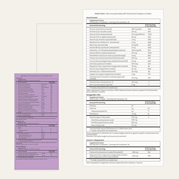 - What's Inside - Each pack contains two Core Prenatal capsules, one Omega 3 DHA + EPA softgel and two Calcium and Magnesium women's vitamins. Our Omega softgel uses prenatal DHA to support your baby's brain, eyes and central nervous system and EPA to support their heart and immune system.*