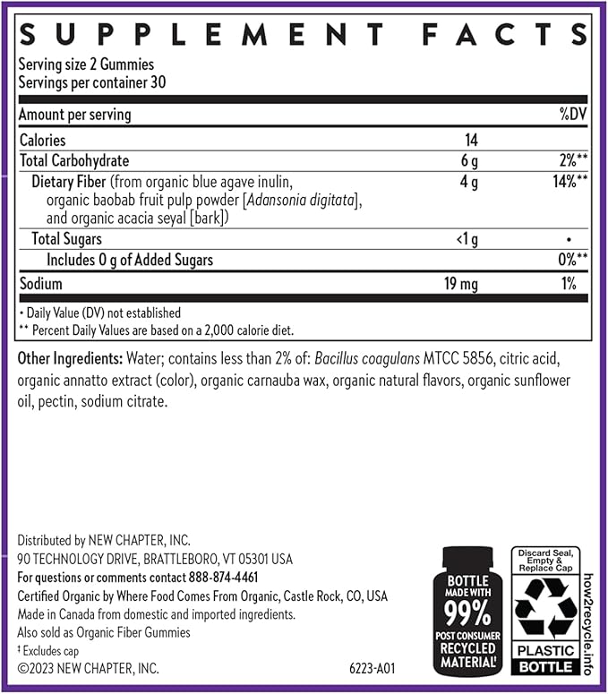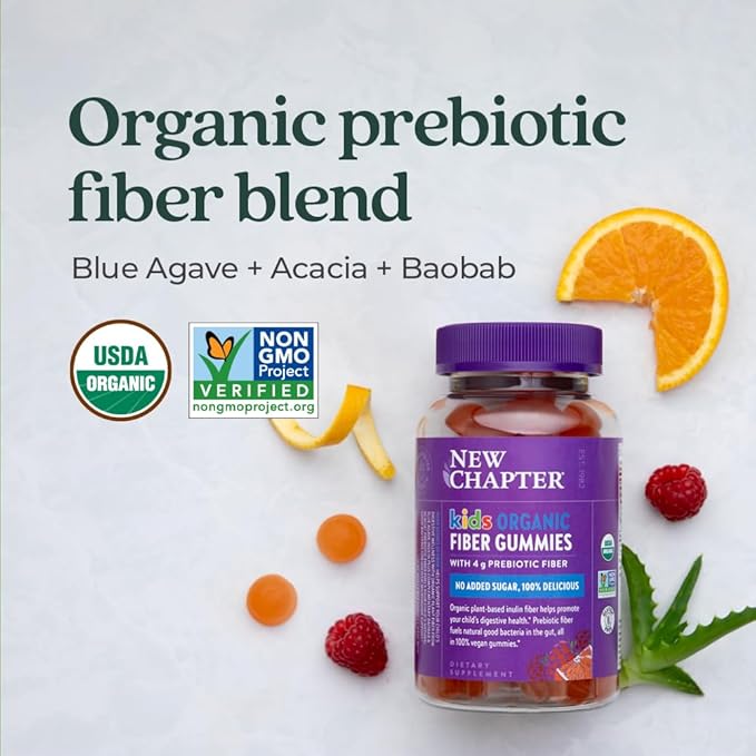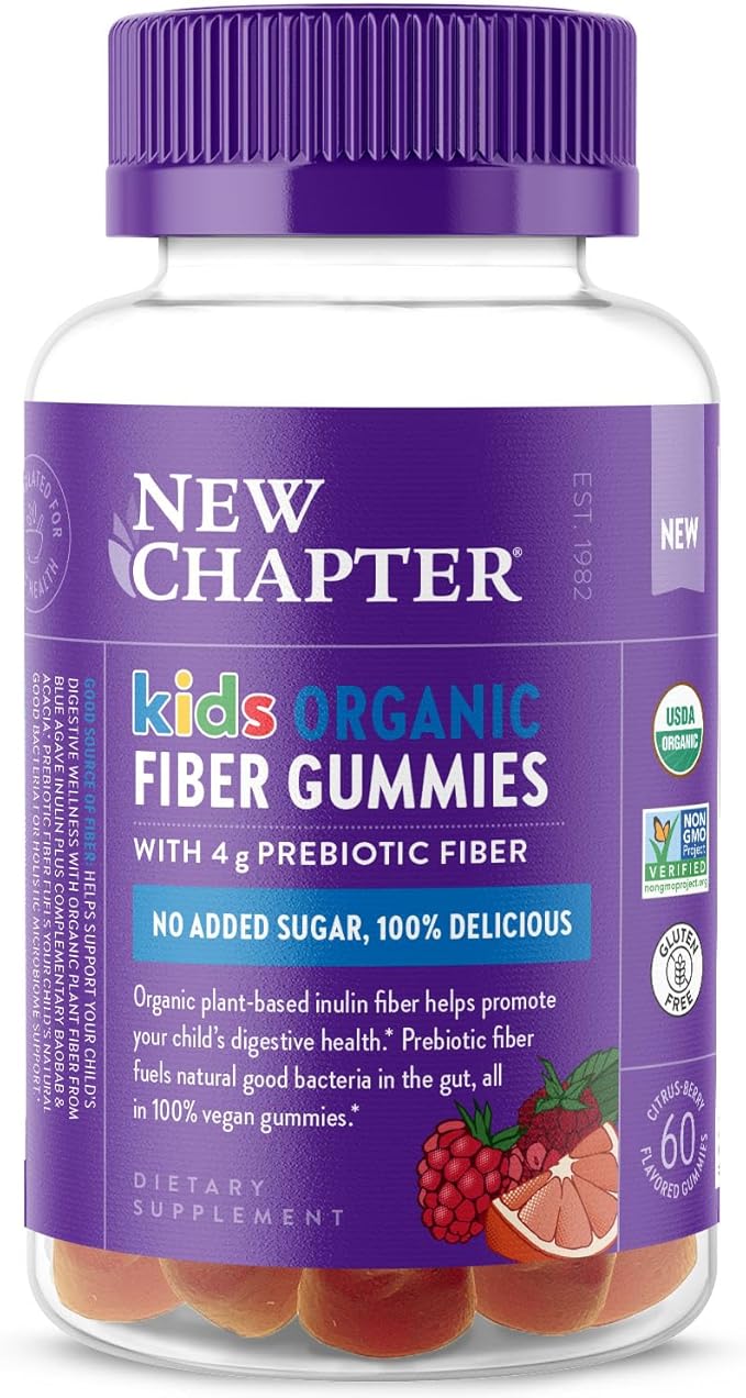 New Chapter Organic Fiber Gummies for Kids, 4g Delicious Plant-Based Prebiotic Fiber for Digestive Health, Vegan, Non-GMO, USDA Organic, Gluten Free, Citrus-Berry Flavored, 60 ct