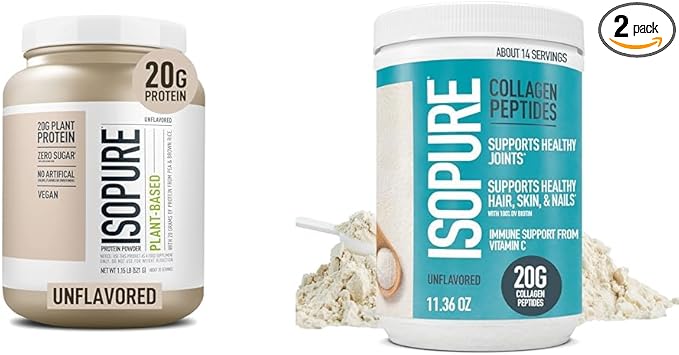 Bundle of Isopure Unflavored Organic Vegan Pea Protein Powder, Dairy Free with Amino Acids, 20 Servings + Isopure Collagen Peptides Powder, 14 Servings, Unflavored, with Vitamin C, with Biotin