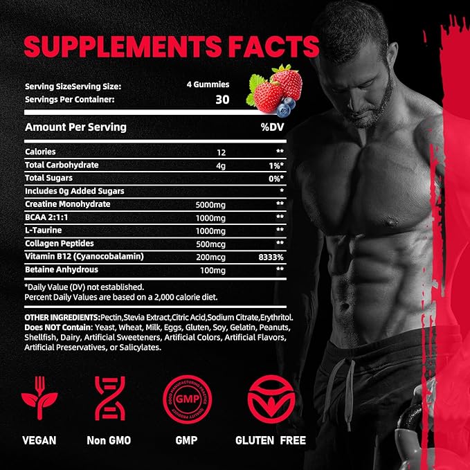 - CREATINE MONOHYDRATE GUMMIES:Creatine is one of the most effective, safe, and well-studied supplement to improve performance,increased muscle endurance,muscle growth or recovery. Just 4 gummies per serving to meet your daily 5g creatine requirement. Get ready to get bigger, stronger, and push beyond your limits — naturally.