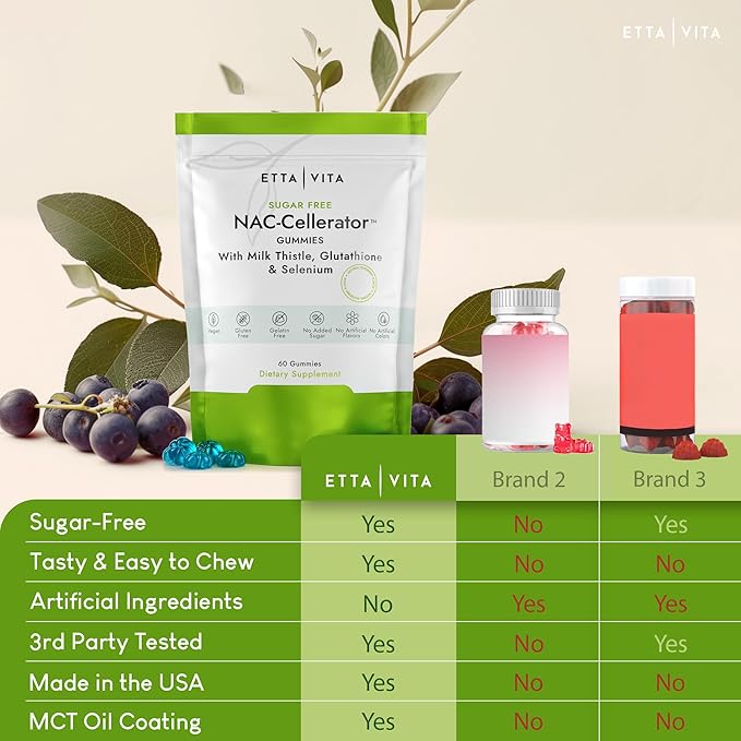 - [Synergistic NAC Complex] - Harness the synergistic power of n-acetyl cysteine nac with Glutathione, Milk Thistle and Selenium to bolster your body's natural defenses with Etta Vita's NAC supplement gummies. The highly absorbent dose of N-Acetyl Cysteine complex gummies provides optimal respiratory and skin health, neutralization of harmful free radicals, combating oxidative stress, while offering neuro-protection and brain restoration to help maintain our most vital organ.