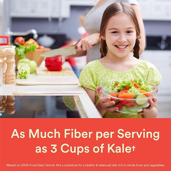 - SAME AMOUNT OF FIBER AS 3 CUPS OF KALE**: US children meet only 45% of the daily value for fiber.** Each gummy serving contains the same amount of fiber as 3 cups of kale** so your child gets more of what they need to maintain regular digestion*