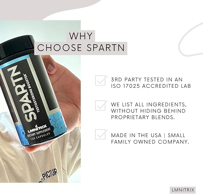 - 0 BANNED SUBSTANCES - SPARTN is 100% FREE of fillers and unlike other testosterone supplements (powders, pills or liquids), contains zero banned substances. SPARTN is manufactured in the USA at our regulated facility and is GMP certified. This means our products are tested and certifies that SPARTN contains the exact ingredients listed on the label and nothing else.