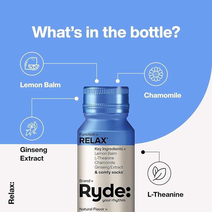 - RELAX: A soothing 2 FL OZ shot with a natural raspberry flavor**, Ryde RELAX helps with staying calm*