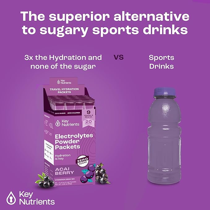 KEY NUTRIENTS Multivitamin Electrolytes Powder Packets - Delicious Acai Berry 20 Pack Hydration Packets - Travel Hydration Powder - No Sugar, No Calories, Gluten Free - Made in USA