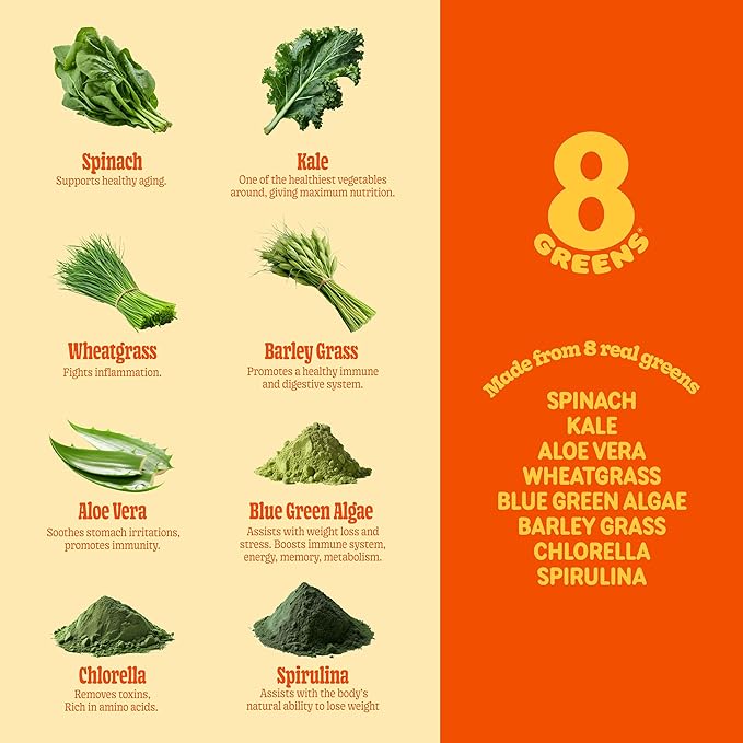 - BOOST GUT HEALTH, FIBER MADE EASY & METABOLISM, 8 ESSENTIAL GREENS, CHOSEN FOR MAXIMUM BENEFITS: Each delicious tangerine gummy is made from 8 powerful greens—Spinach, Wheatgrass, Kale, Blue Green Algae, Spirulina, Aloe Vera, Chlorella, and Barley Grass—carefully selected to enhance digestive health, boost metabolism, and provide an easy source of fiber. Take 1-4 gummies daily to experience the full benefits of these nutrient-rich superfoods.