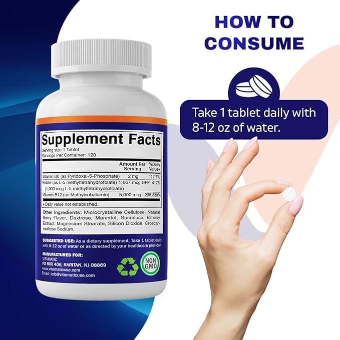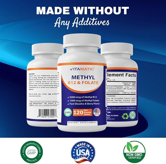 Vitamatic Methyl Folate & B12 Supplement with Pyridoxal 5 Phosphate (P-5-P) - Promotes Cardiovascular Health & Energy Metabolism - 120 Fast Dissolve Tablets - Non GMO & Gluten Free