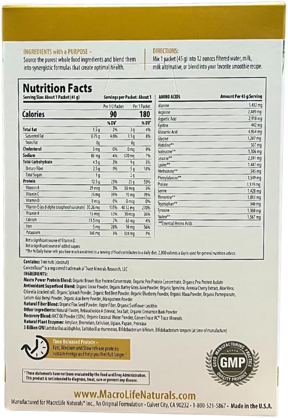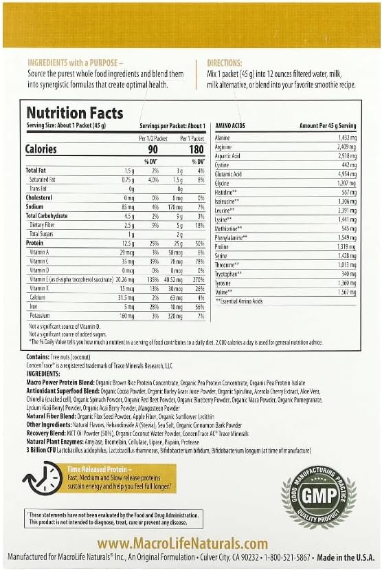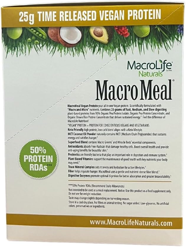 MacroLife Naturals MacroMeal Vegan Chocolate Superfood Supplement Powder Protein + Greens, Probiotics, Digestive Enzymes, Fiber - Energy, Detox, Immune - Non-GMO, Gluten-Free - 10 Packet Servings