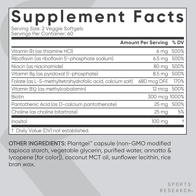- FULL SPECTRUM SUPPORT: Sports Research Vitamin B-Complex supplement contains the full spectrum of all 8 B vitamins, including Biotin, Niacin and Vitamin B12 for 3-in-1 support of various metabolic, nerve, and cell processes.*