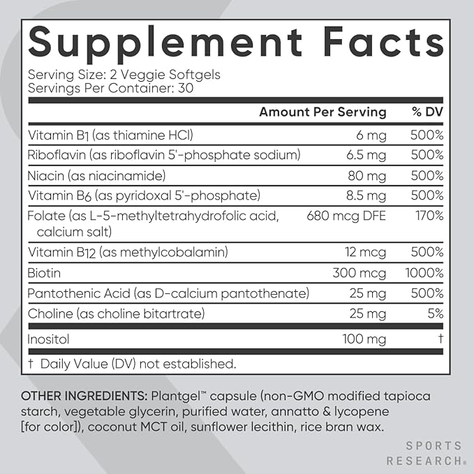 - FULL SPECTRUM SUPPORT: Sports Research Vitamin B-Complex supplement contains the full spectrum of all 8 B vitamins, including Biotin, Niacin and Vitamin B12 for 3-in-1 support of various metabolic, nerve, and cell processes.*
