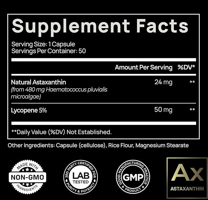 - Special Ingredients : Astaxanthin 24mg (from MicroAlgae), Lycopene 50mg, Astaxanthin, Lycopene