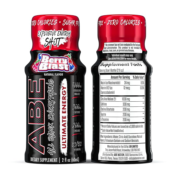 - Athlete-Tested and Stimulant-Packed: Tested for athletes, these shots are formulated to provide the necessary stimulant and caffeine boost required for optimal performance, gains, and endurance during workouts. Shake well before use and consume one 60ml shot daily, ideally before your workout, to experience the full energy and focus benefits of ABE Energy Shots.