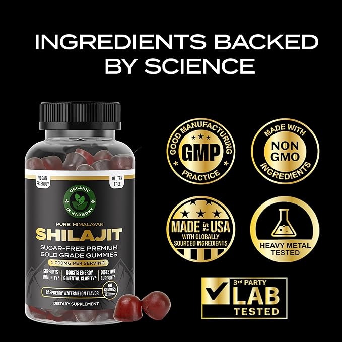 - PREMIUM QUALITY SHILAJIT EXTRACT: Organic in Harmony always focuses on providing high-quality products to its customers. Our pure organic shilajit resin gummies are presented in their pure, minimally processed form. They are vegan-friendly, gluten-free, non-GMO, third-party tested, and made in the USA in a GMP-certified facility.
